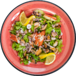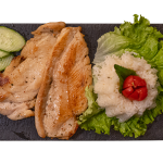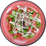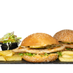 лајбица, пилешки стек, марула, помфрит, кисели краставички, бургер сос, мешана салата