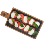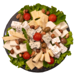 свинска и говедска пршута, свински врат, сланина, кулен, пилешка и свинска шунка, кравјо сирење, свилена моцарела, кравји кашкавал, бергардер – сино сирење, пармезан коцки, пилешки прсти, пирошка, зденки, паниран кашкавал, шери, рукола, корпи (три) со мешани крем салати, маслинки, порција фурнарини