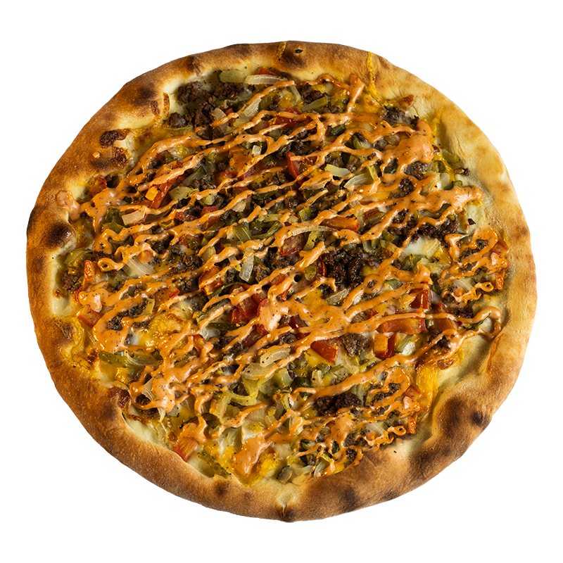 моцарела, чедар, телешко месо, краставички, кромид, домати, бургер сос